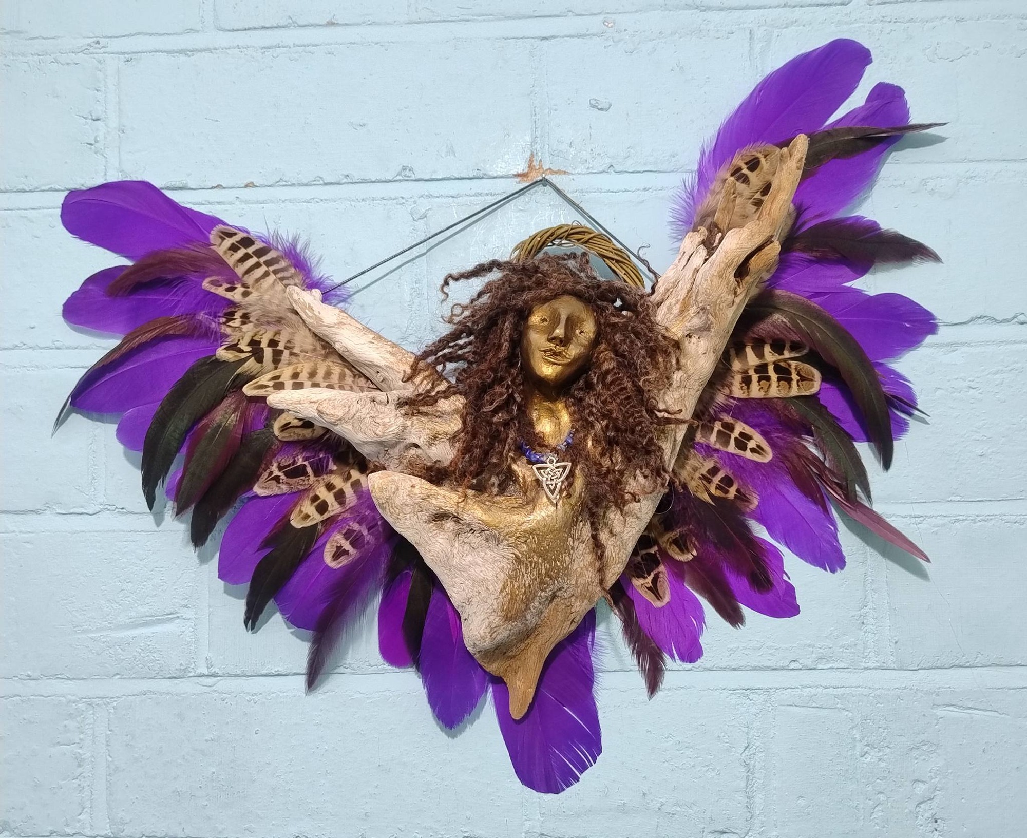 A large statement and unique mixed media sculpture by Vicki Jayne Yates. Using driftwood, clay, naturally moulted hand painted feathers and a hand made green aventurine crystal necklace.
