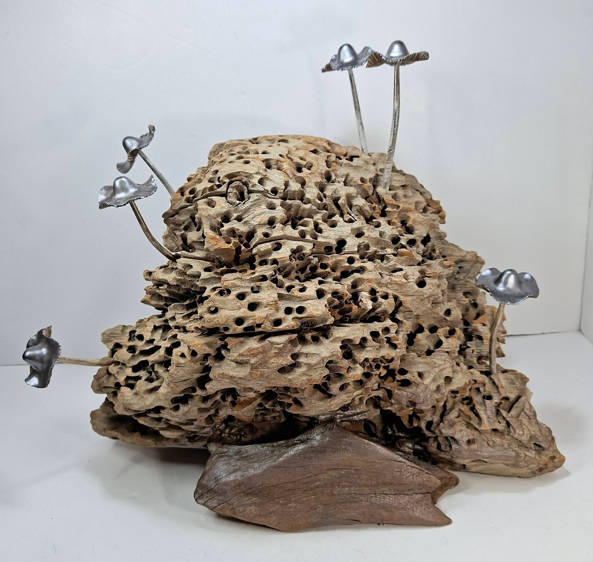 This sculpture is made from driftwood for the connection to the sea and the water element that washed it to shore. The clay to connects us to mother earth. There is a blue goldstone crystal for the horse's eye.