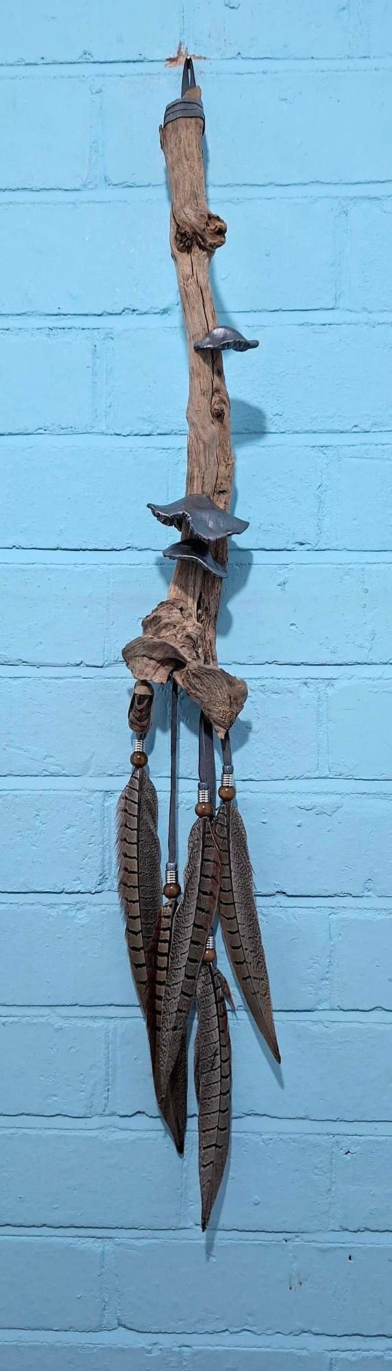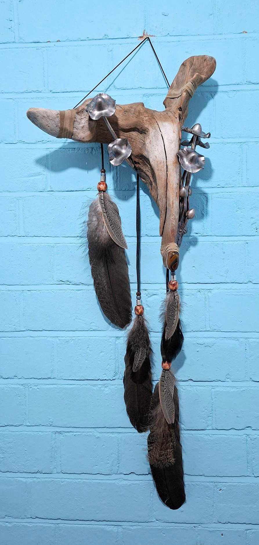 This original sculpture is made from driftwood, clay, leather and feathers. A unique and stunning sculpture that tells the story the horse spirit.
